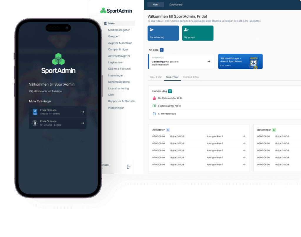 SportAdmin makes it possible to manage members, payments, and communication in one single tool – tailored for club offices, coaches, and parents.